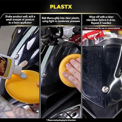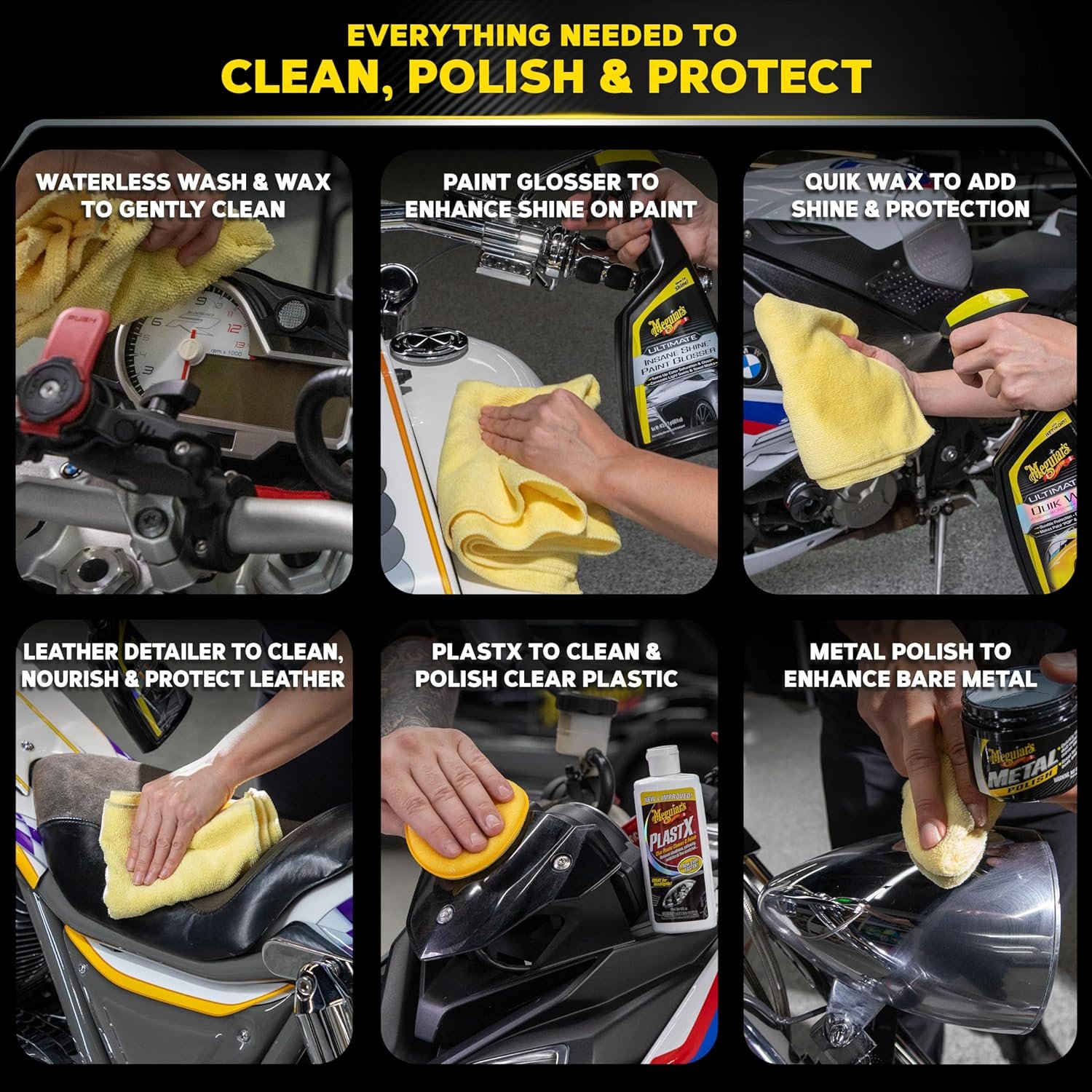 - CLEAN, POLISH & PROTECT: Included in this collection of motorcycle detailing supplies is Plasxt which cleans and enhances clarity on uncoated plastics, Metal Polish to clean and shine uncoated metals, and Ultimate Leather Detailer to maintain leather